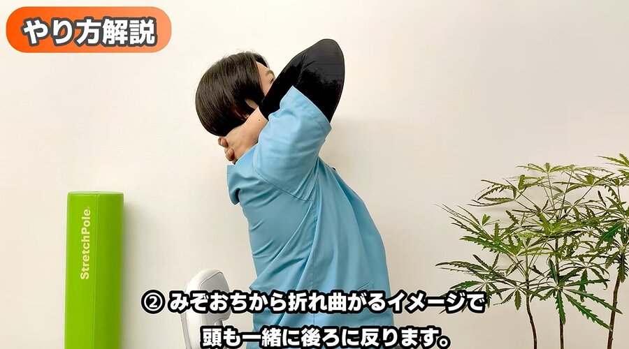 ② みぞおちから折れ曲がるイメージで、頭も一緒に後方に反ります。