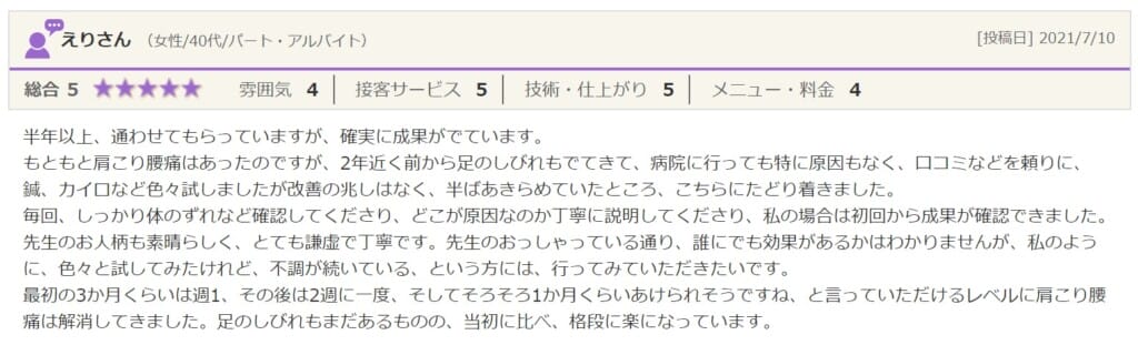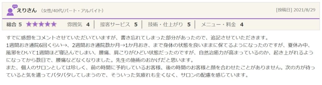 1週間おき通院6回くらい→、2週間おき通院数か月→1か月おき、まで身体の状態を良いままに保てるようになったのですが、夏休み中、風邪をひいて1週間ほど寝込んでしまい、腰痛、肩こりがひどい状態だったのですが、自然治癒力が高まっているのか、起き上がれるようになってから数日で、腰痛などなくなりました。先生の施術のおかげだと思います。また、個人のサロンとしては珍しく、前の時間に予約しているお客様、後の時間のお客様と顔を合わせたことがありません。次の方が待っていると気を遣ってバタバタしてしまうので、そういった気疲れも全くなく、サロンの配慮を感じています。
