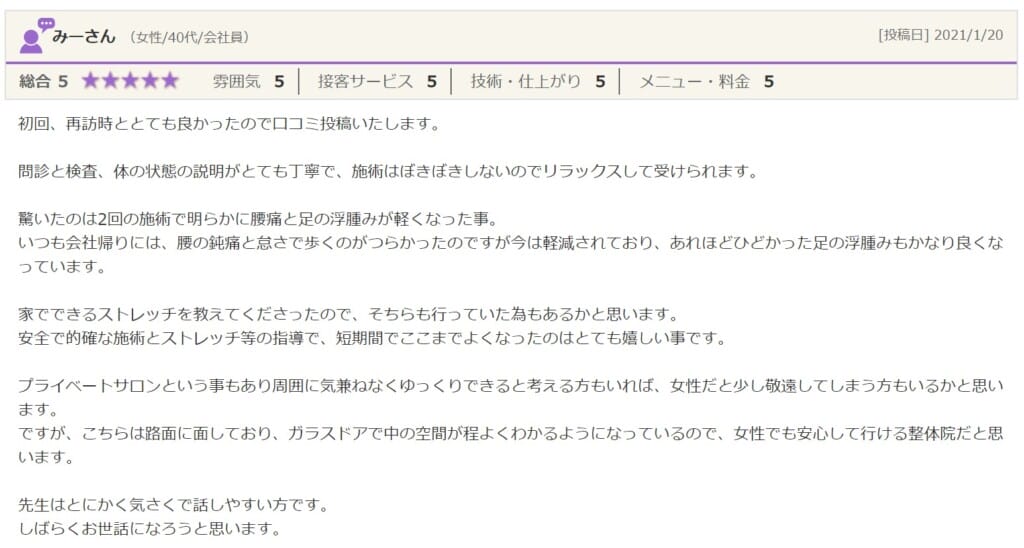 問診と検査、体の状態の説明がとても丁寧で、施術はぼきぼきしないのでリラックスして受けられます。驚いたのは2回の施術で明らかに腰痛と足の浮腫みが軽くなった事。いつも会社帰りには、腰の鈍痛と怠さで歩くのがつらかったのですが今は軽減されており、あれほどひどかった足の浮腫みもかなり良くなっています。家でできるストレッチを教えてくださったので、そちらも行っていた為もあるかと思います。安全で的確な施術とストレッチ等の指導で、短期間でここまでよくなったのはとても嬉しい事です。