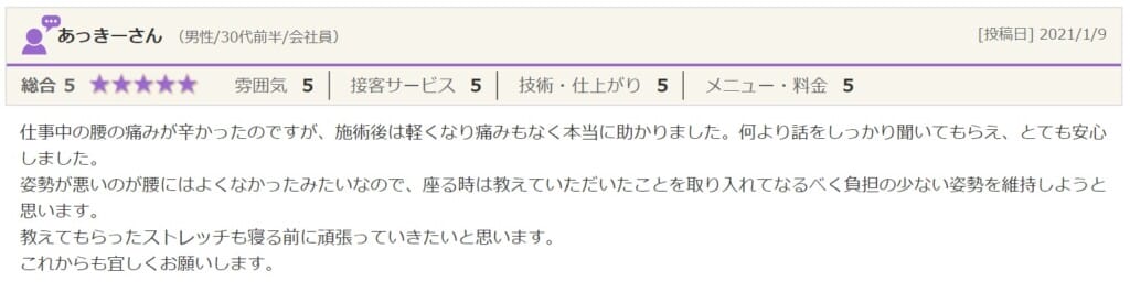 仕事中の腰の痛みが辛かったのですが、施術後は軽くなり痛みもなく本当に助かりました。何より話をしっかり聞いてもらえ、とても安心しました。姿勢が悪いのが腰にはよくなかったみたいなので、座る時は教えていただいたことを取り入れてなるべく負担の少ない姿勢を維持しようと思います。教えてもらったストレッチも寝る前に頑張っていきたいと思います。これからも宜しくお願いします。