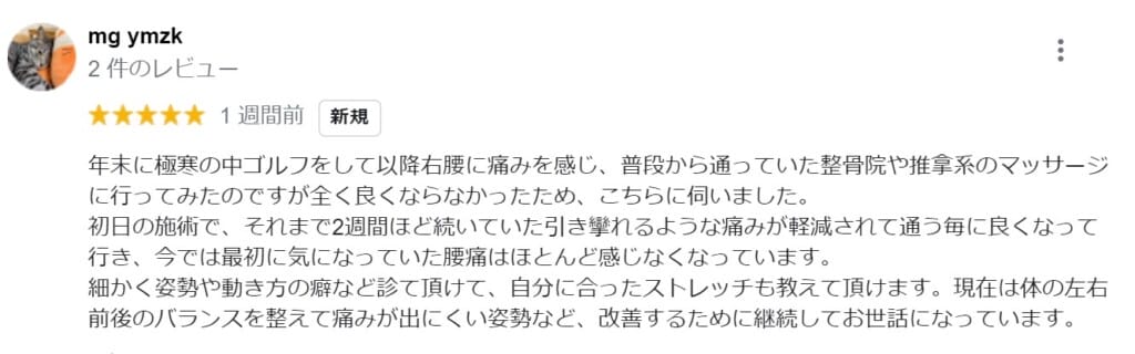 年末に極寒の中ゴルフをして以降右腰に痛みを感じ、普段から通っていた整骨院や推拿系のマッサージに行ってみたのですが全く良くならなかったため、こちらに伺いました。初日の施術で、それまで2週間ほど続いていた引き攣れるような痛みが軽減されて通う毎に良くなって行き、今では最初に気になっていた腰痛はほとんど感じなくなっています。細かく姿勢や動き方の癖など診て頂けて、自分に合ったストレッチも教えて頂けます。現在は体の左右前後のバランスを整えて痛みが出にくい姿勢など、改善するために継続してお世話になっています。