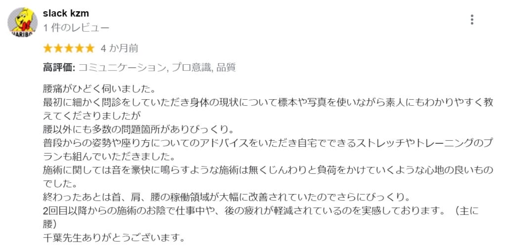 終わったあとは首、肩、腰の稼働領域が大幅に改善されていたのでさらにびっくり。2回目以降からの施術のお陰で仕事中や、後の疲れが軽減されているのを実感しております。(主に腰)千葉先生ありがとうございます。