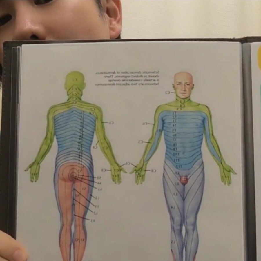 ここで参照したのが「デルマトーム(神経支配領域の地図)」です。背骨から分かれる神経が、体のどの範囲の感覚・運動を担うかを示すもので、Eさんの訴えは図の緑色領域に概ね一致していました。