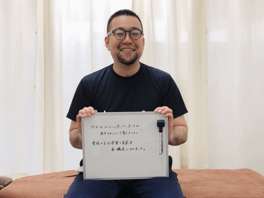 仕事中の痛みが辛かったのですが、施術後は軽くなり痛みもなく本当に助かりました。何より話をしっかり聞いてもらえ、とても安心しました。姿勢が悪いのが腰にはよくなかったみたいなので、座る時は教えていただいたことを取り入れてなるべく負担の少ない姿勢を維持しようと思います。教えてもらったストレッチも寝る前に頑張っていきたいと思います。これからも宜しくお願いします。