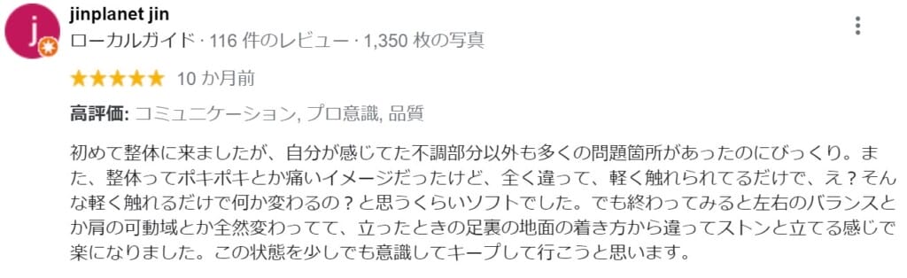 先日はありがとうございました!施術前のカウンセリング・現状チェックの時間がしっかりとられているのが印象的でした。その場限りで痛み緩和やリラクゼーションを求めるのではなく、根本的に身体の歪みを消したいという人に合いそうな整体院だと思います。施術自体は軽ーくほぐされているような感覚で、終了後に首や肩が柔らかくなったり、身体のバランスが改善されていたりするのが不思議でした。身体が固く、筋肉も凝り固まっているので大概の整体やマッサージ類は少なからず痛みを感じるのですが、今回はまったくありませんでした。しばらく通わせていただこうと思います!