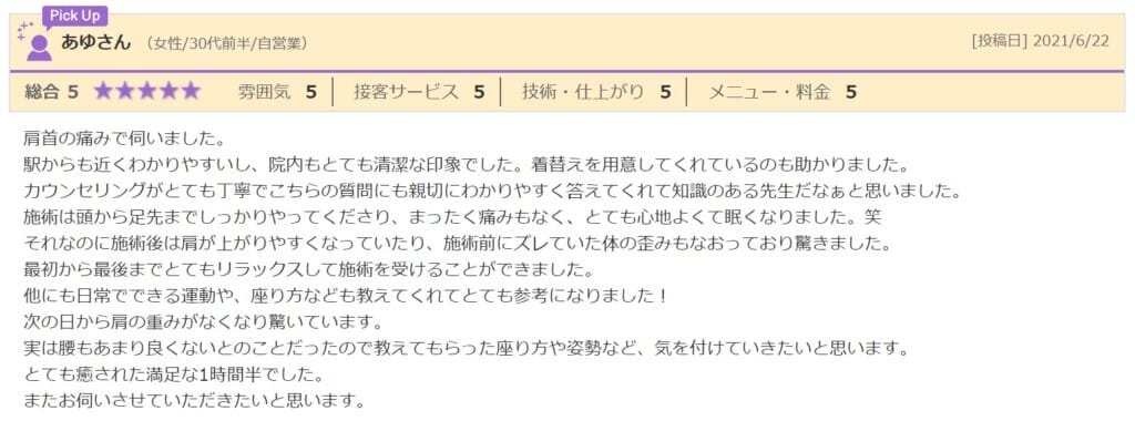 肩首の痛みで伺いました。駅からも近くわかりやすいし、院内もとても清潔な印象でした。着替えを用意してくれているのも助かりました。カウンセリングがとても丁寧でこちらの質問にも親切にわかりやすく答えてくれて知識のある先生だなぁと思いました。施術は頭から足先までしっかりやってくださり、まったく痛みもなく、とても心地よくて眠くなりました。笑それなのに施術後は肩が上がりやすくなっていたり、施術前にズレていた体の歪みもなおっており驚きました。最初から最後までとてもリラックスして施術を受けることができました。他にも日常でできる運動や、座り方なども教えてくれてとても参考になりました!次の日から肩の重みがなくなり驚いています。実は腰もあまり良くないとのことだったので教えてもらった座り方や姿勢など、気を付けていきたいと思います。とても癒された満足な1時間半でした。またお伺いさせていただきたいと思います。