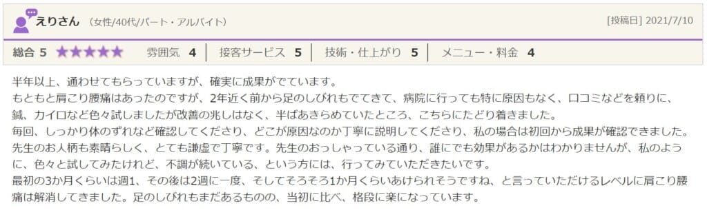 半年以上、通わせてもらっていますが、確実に成果がでています。もともと肩こり・腰痛はあったのですが、2年近く前から足のしびれもでてきて、病院に行っても特に原因もなく、口コミなどを頼りに、鍼、カイロなど色々試しましたが改善の兆しはなく、半ばあきらめていたところ、こちらにたどり着きました。毎回、しっかり体のずれなど確認してくださり、どこが原因なのか丁寧に説明してくださり、私の場合は初回から成果が確認できました。先生のお人柄も素晴らしく、とても謙虚で丁寧です。先生のおっしゃっている通り、誰にでも効果があるかはわかりませんが、私のように、色々と試してみたけれど、不調が続いている、という方には、行ってみていただきたいです。最初の3か月くらいは週1、その後は2週に一度、そしてそろそろ1か月くらいあけられそうですね、と言っていただけるレベルに肩こり腰痛は解消してきました。足のしびれもまだあるものの、当初に比べ、格段に楽になっています。