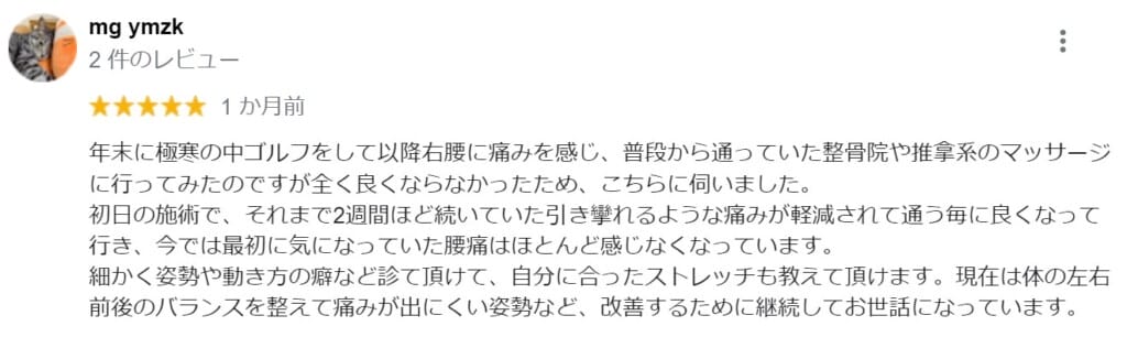 年末に極寒の中ゴルフをして以降右腰に痛みを感じ、普段から通っていた整骨院や推拿系のマッサージに行ってみたのですが全く良くならなかったため、こちらに伺いました。初日の施術で、それまで2週間ほど続いていた引き攣れるような痛みが軽減されて通う毎に良くなって行き、今では最初に気になっていた腰痛はほとんど感じなくなっています。細かく姿勢や動き方の癖など診て頂けて、自分に合ったストレッチも教えて頂けます。現在は体の左右前後のバランスを整えて痛みが出にくい姿勢など、改善するために継続してお世話になっています。