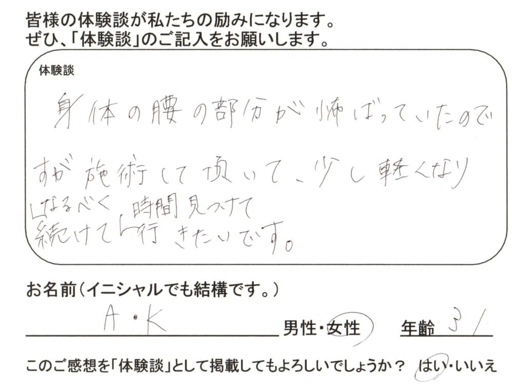 身体の腰の部分がこわばっていたのですが、施術して頂いて、少し軽くなりなるべく時間見つけて続けて行きたいです。
