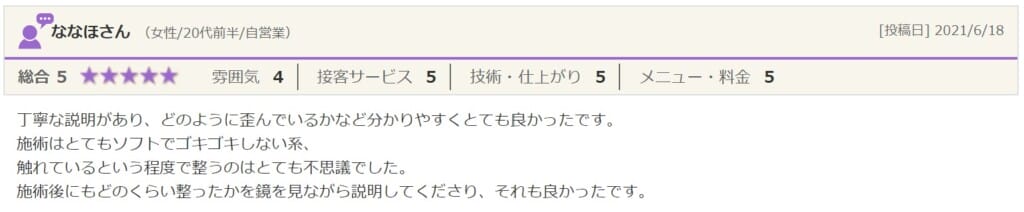 丁寧な説明があり、どのように歪んでいるかなど分かりやすくとても良かったです。施術はとてもソフトでゴキゴキしない系、触れているという程度で整うのはとても不思議でした。施術後にもどのくらい整ったかを鏡を見ながら説明してくださり、それも良かったです。