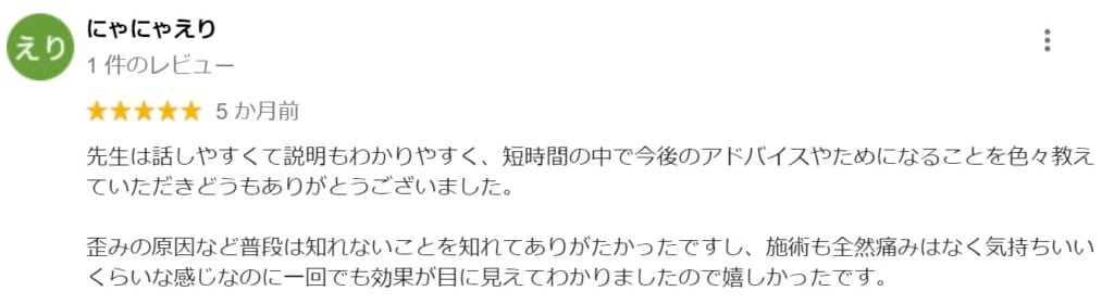先生は話しやすくて説明もわかりやすく、短時間の中で今後のアドバイスやためになることを色々教えていただきどうもありがとうございました。歪みの原因など普段は知れないことを知れてありがたかったですし、施術も全然痛みはなく気持ちいいくらいな感じなのに一回でも効果が目に見えてわかりましたので嬉しかったです。