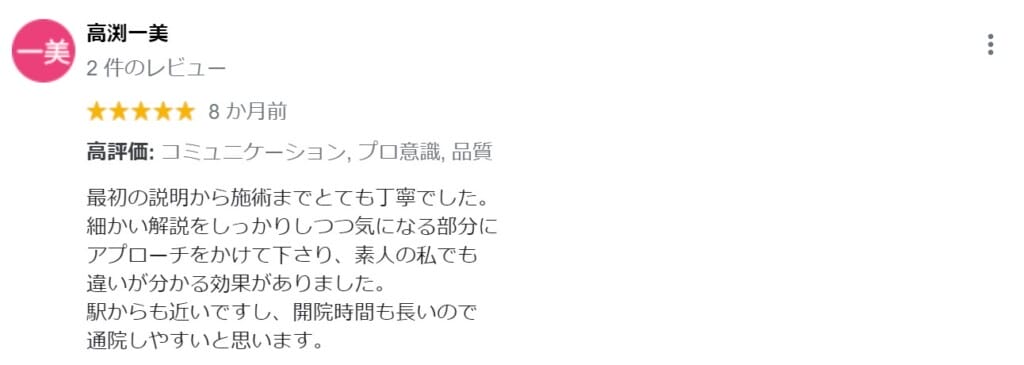 最初の説明から施術までとても丁寧でした。細かい解説をしっかりしつつ気になる部分にアプローチをかけて下さり、素人の私でも違いが分かる効果がありました。駅からも近いですし、開院時間も長いので通院しやすいと思います。